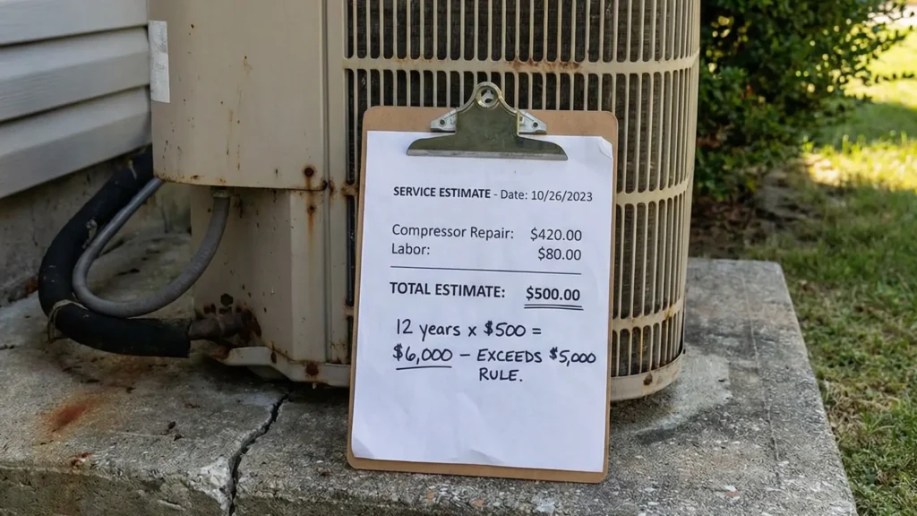 The math is simple. Say you have a 12-year-old AC and you’re looking at a $350 repair. Multiply 12 by 350, and you get $4,200 — under the $5,000 threshold, so repair is probably the right call. But if that same 12-year-old unit needs a $500 repair, the math comes out to $6,000. At that point, the numbers point toward replacement.
